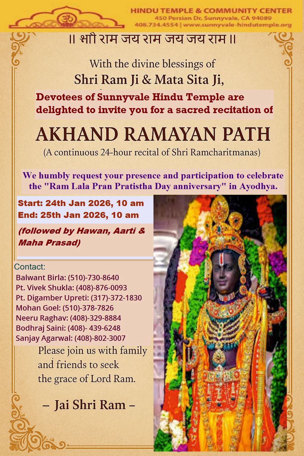 On the event of Ayodhya Ramalaya Prana Prathista Day Anniversary, Sunnyvale temple will be celebrating with following events. All devotees are welcome to join this event and get blessings of Lord Sita Rama Swamy.